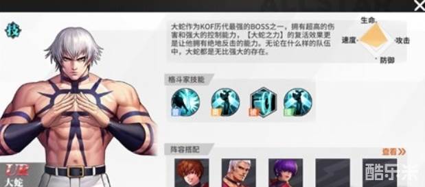 大蛇在游戏中定位为残局收割,献祭强化,能对敌方全体造成属性伤害和真实伤害,在己方格斗家被击败时能获得高额属性加成;不愧是四天王费劲心思甚至不惜献祭自己也要复活他的角色。