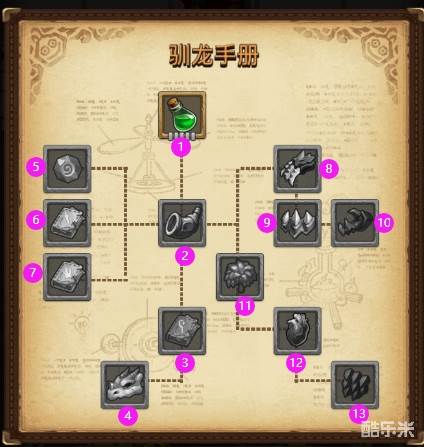 驯龙手册在1层翻驯龙师的残骸获得,使用幻龙资料和龙之精魄研究项目,驯龙手册的所有项目只对幻龙生效。研究项目每级消耗均相同。需要研究前置至少1级才能研究后续项目。