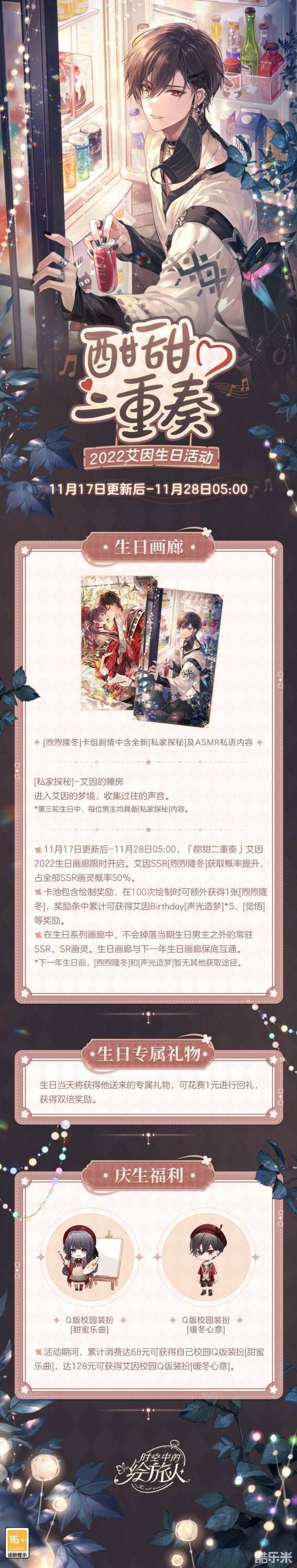 《时空中的绘旅人》2022艾因生日活动「酣甜二重奏」将于11月17日开启。黎城“出逃”,弥补过失,四手联弹,陪艾因度过一个不一样的生日。参与游戏体验活动,海量福利等你开启。