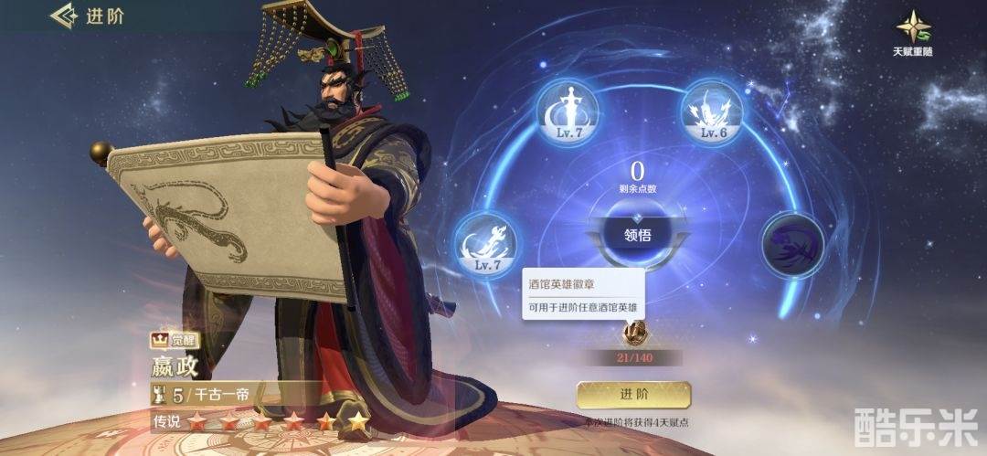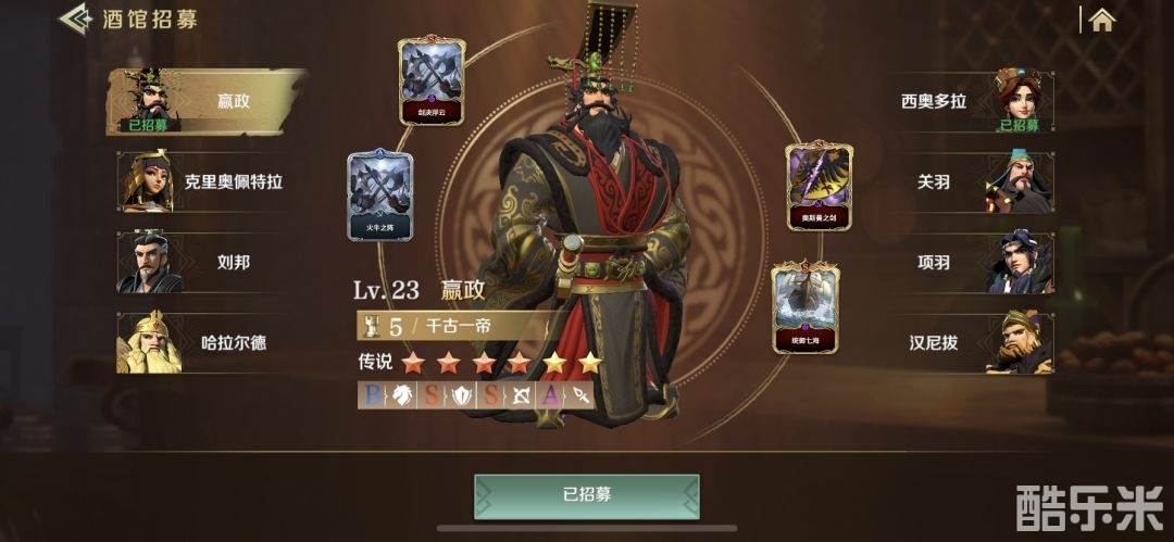 作为「酒馆英雄」的嬴政,其核心技能名为【剑决浮云】,技能效果是:战斗中,自身和随机友方释放主动技能,有一定概率再释放一次。搭配的其他三个技能分别是【火牛之阵】、【奥斯曼之剑】和【统御七海】。