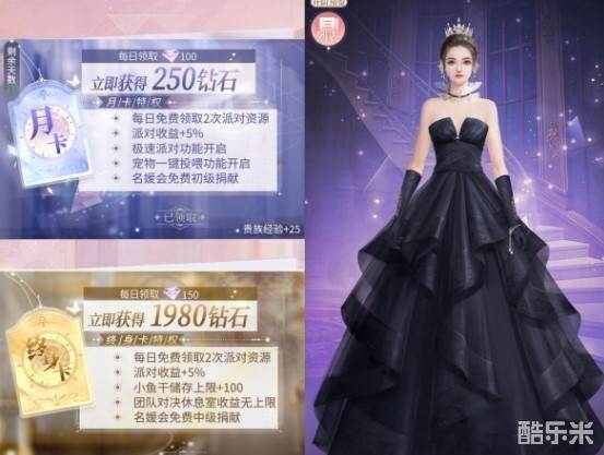 第一个,氪金必选之——特权卡。特权卡有25块的月卡和198的终身卡。月卡是必须购买!喂猫、游历、派对收取等都会感受到一键的快乐,买完马上就能领250钻石,还能去领限时充值的奖励。(这里说一下,限时充值里每日充值的奖励有个美食系列的参与道具,第一期是火锅,参与完记得去背包的活动道具里使用,加的影响力还挺多的)。月卡每天还能领100钻,算下来一个月就有3k钻这样,比钻石充值性价比高挺多。如果不买其他的随便充个6元就能到VIP1还能拿套衣服,领VIP礼包,里面的资质券我看基本都是冲榜奖励的稀有物,感觉还行。