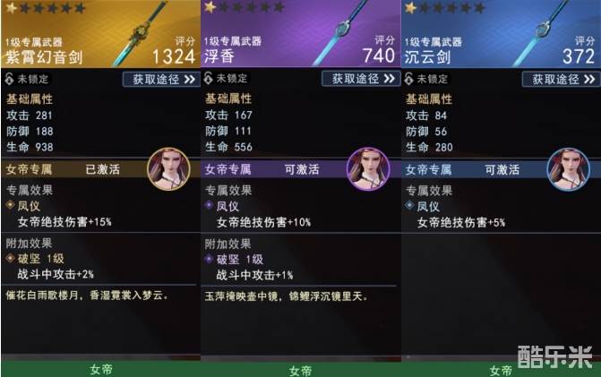 绝品武器:紫霄幻音剑。专属效果凤仪(绝技伤害+15%),附加效果破坚(战斗中攻击+2%)