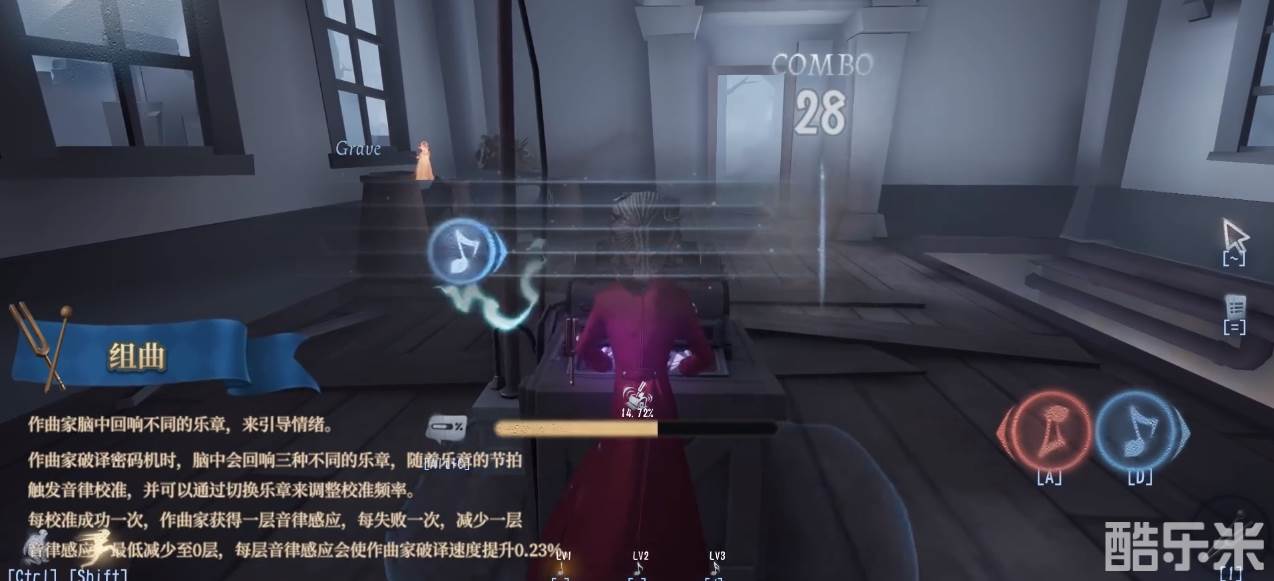 作曲家破译密码机时,脑中会回响三种不同的乐章,随着乐章的节拍触发音律校准,并可以通过切换乐章来调整校准频率。每校准成功一次,作曲家获得一层音律感应,每失败一次,减少一层音律感应,最低减少至0层,每层音律感应会使作曲家破译速度提升0.23%。
