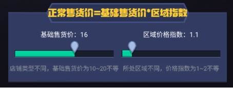然后有个区域价格指数,这个值会跟进店铺所处的区域变化,例如梦想镇的区域价格指数是1,儒商区的价格指数是1.1,而店铺的货价为店铺基础货价*区域价格指数,所以货价提升最简单的方式就是在更高级的区域去建店铺。影响货价的因素还有店铺星级、商道专精、协会加成、主角管理技能加成等,这些值在前期都比较难提升,因此在前期只要在可以买地的最高级区域建店就行了。