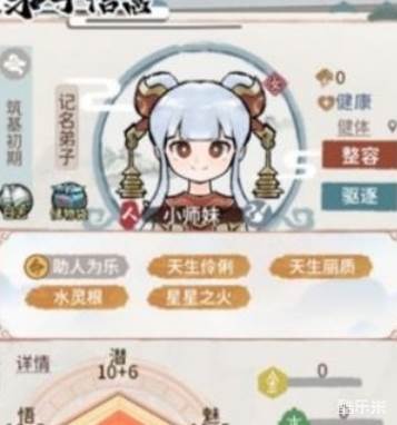 首先我们打开游戏,点一下弟子选项。我们可以看到有一个角色叫作小师妹。听起来名字是不是萌萌哒,但是她的实力却是很强悍的。现在等级最高的就是她,六维图上的数据,都是非常强大的。