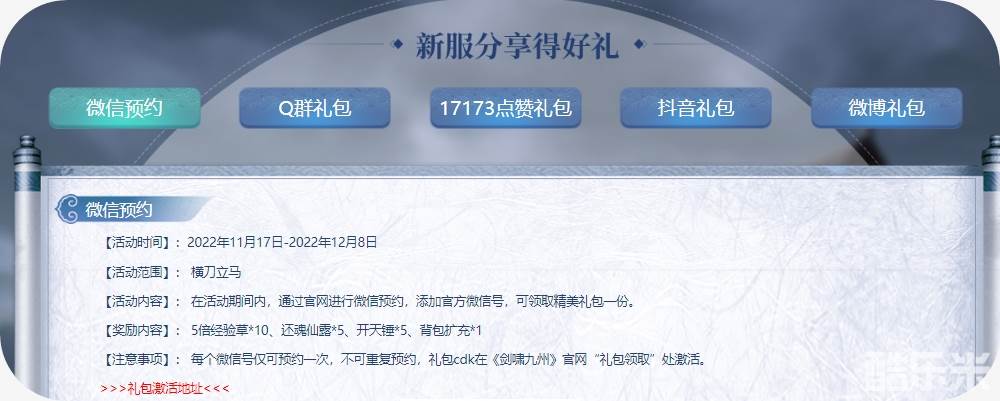 11月15日起进入《剑啸九州》官网即可进行手机预约获得预约礼包码(其中包含永久潇洒紫金葫芦坐骑),同时可以添加官方企业微信获得微信预约礼包码一个哦~