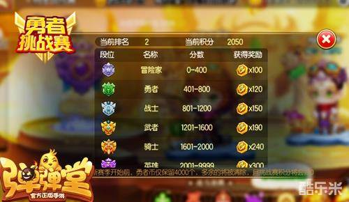 “勇者挑战赛”采用专属积分制度的匹配机制,保证玩家能遇到水平相近的对手,让对战双方都能充分发挥自己的弹射技巧。根据积分,《弹弹堂手游》勇者挑战赛分为6个段位,它们由低到高分别是“冒险家”“勇者”“战士”“武者”“骑士”“英雄”,每个段位都有对应的徽记。