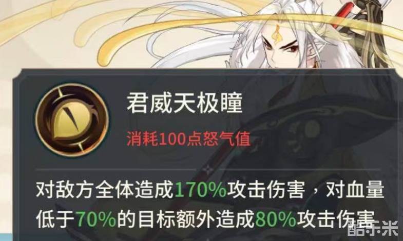 最后再来看看他的天赋技能君威天极瞳:能够对敌方全体目标造成170%的攻击伤害,对于一些血量低于百分之70的目标还会额外造成80%的攻击伤害,对于收割战场的时候,往往能够发挥奇效。