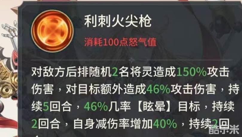哪吒天赋技能利刺火尖枪效果:能够对敌方的后排随机两名将灵造成150%的攻击伤害,还能够对目标额外造成46%的攻击伤害,这个效果会持续五回合,并且还有百分之46的几率能够直接眩晕目标,效果持续两个回合,自身的减伤率能够增加百分之40,这个效果持续两个回合。