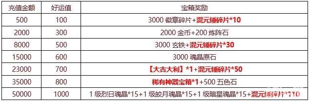 【活动内容】活动期间可通过充值金币获得好运值,积累好运值即可打开宝箱奖励,闪耀称号,全新神器,绝对超值的提升战力资源,尽在特惠好礼。