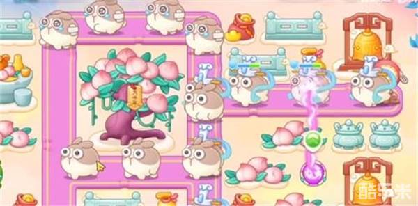 2.等第一只兔子走到左边钱袋下方的时候,我们就暂停,左下角的魔法饼有金币后直接升级,然后继续 锁定钱袋。