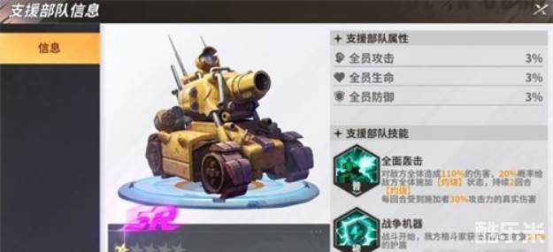 战车直升机能为格斗家提升生命、攻击、防御属性加成,两个技能对敌方攻击力最高格斗家轰炸,被动技能反击攻势,当我方格斗家被敌方击退时,有很大的概率对敌方格斗家发起轰炸,并造成眩晕,让其在短时间内无法行动。