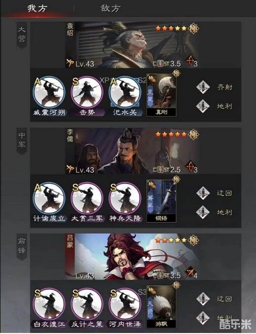 这队战法无可调整,基本就是标准战法,兵种特性也是一样,如果追求更极致的输出,吕蒙李儒的迂回可以换齐射,那样的袁绍法刀经常1-2回合穿透白板肉队,当然适应性就会稍差一些,大家可以根据自己的气质卡池来玩。