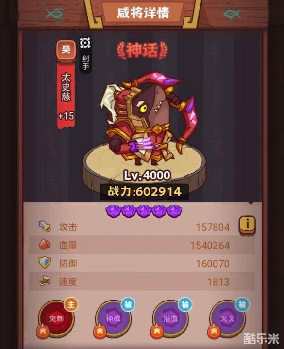 太史慈:太史慈是神话品质的咸将,射手位置,拥有超高的输出能力,战斗过程中可使自身攻击,暴击和生命都得到大幅度提升。