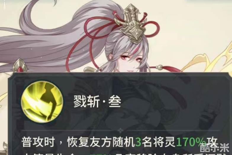 首先娲皇的技能戮斩,在普通攻击的时候能够随机恢复友方三名将灵170%攻击力的等量生命值,关键是还能够有77%的几率能够移除自己受到的沉默、燃烧等debuff状态,可以说是非常强力的。