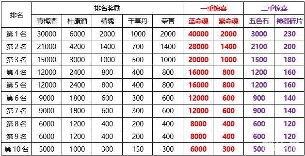 活动期间累计充值金币达到10000金币,可以额外领取一重惊喜奖励(蓝命魂,紫命魂);