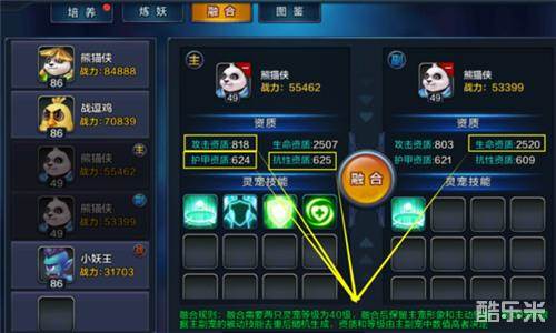 另外融合也是加强灵宠功力的黑科技!通过融合主副宠可以生成新的灵宠,保留主宠的形象外观以及主动技能,灵宠等级和灵宠资质以及上限使用主副宠之中等级较高的数值;被动技能根据主副宠的被动技能去重后随机生成。假设主宠拥有太极拳、初级杀气、初级鹰眼、初级护盾,副宠拥有龙炎纵横、初级鹰眼、初级暴怒,因为主副宠拥有同样的初级鹰眼技能,所以融合后的宠物会在四种被动中随机生成,所以如果想要获得更多技能灵宠,需要先将主副宠的被动技能通过炼妖初级技能书来将重复技能顶替以增加获得多技能灵宠的概率!另外,先炼妖洗练获得更高属性再进行融合,收益会更高哦!