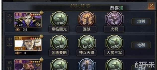 组建新部队,5等级刘虞统帅厅后送一个,5等级孙坚,7等级曹操,组成1700兵力三将队。