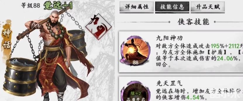 技能方面,玩家们可以看到有九阳神功,就知道他的技能如何了。必杀九阳神功作为群攻大招,有着基础195%的攻击倍率,配上额外的大量外功加成,其实伤害还可以,不过最主要的还是其额外效果,可以为全体友方角色添加本次伤害25%左右的护盾,持续时间为2回合。