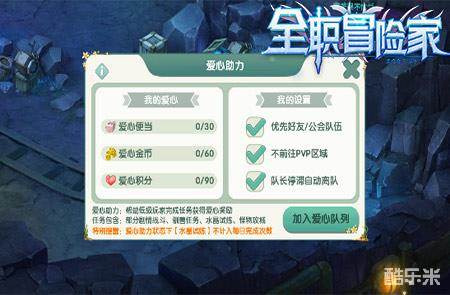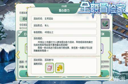 等级达到40级的勇者们可以通过日程中的“爱心助力”or右侧面板的“助力”加入爱心队列,帮助所有的小伙伴进行任务。