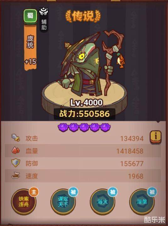 庞统:庞统是蜀国传说品质的咸将,场上位置为辅助,首次阵亡可恢复至满血状态,并附赠减伤效果。