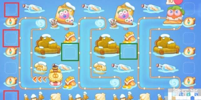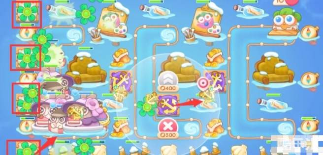 1、这一关最好是有范围输出炮塔和减速炮塔玩的会比较稳妥,推荐选择:风扇、飞机、船锚、魔法球、鱼刺等作为主力输出。