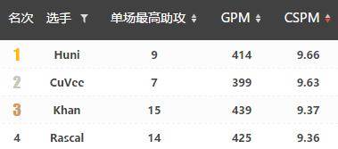 在CSPM这项数据上,LCK四位上单(包括Rascal)排名上单位前四——