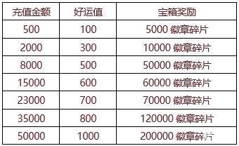 【活动内容】活动期间可通过充值金币获得好运值,积累好运值即可打开宝箱奖励,超多的徽章碎片,徽章等级不断攀升,绝对超值的提升战力资源,尽在特惠好礼。