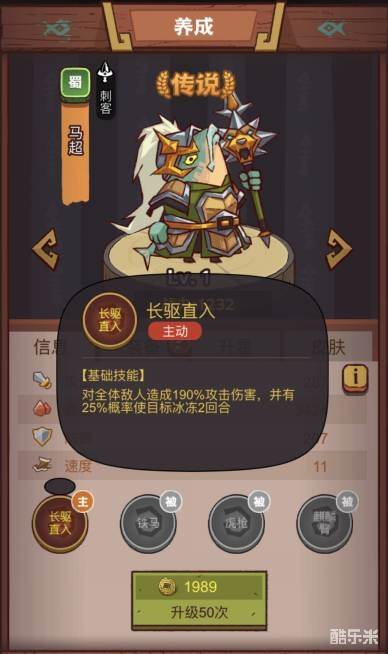 马超:血量550亿,大招的长驱直入,释放效果是对全体敌人造成190%攻击伤害,并有25%概率使目标冰冻2回合。