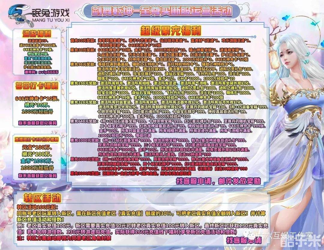 活动一:进游福利:进游送满VIP、送648元充值卡*9999张、648元神充卡*20张、神仙眷侣时装、富贵飞毯坐骑皮肤、蝶恋花护灵翼皮肤、护士甜心仙宠皮肤、【通用码:svip6666】