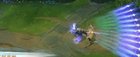 二技能叫万箭齐发,艾希拉弓搭箭向目标区域如天女散花一般射出剑雨,攻击范围很广。对被击中目标造成物理伤害。