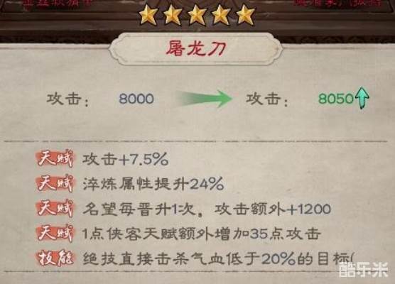 倚天剑的技能有概率能直接削掉敌方目标百分比气血上限的血量,不过个人觉得可能还需要再加强一下,乍一看应该是为了解决防高血厚的肉盾用的,但应该也没有人会带好几个肉盾上阵吧,如果队伍中只有一个肉盾侠客,毒和燃烧这种更直接的真伤效果会更显著,至少在有可以帮助侠客免疫负面状态的BUFF出来之前是这样。