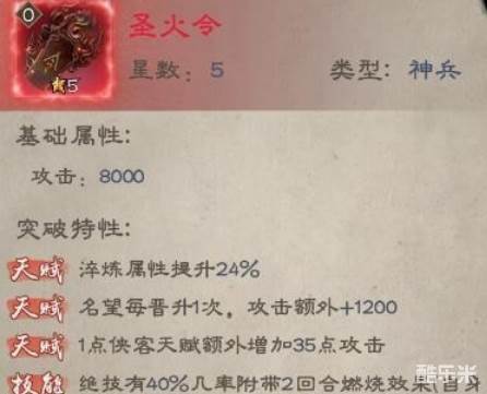 圣火令附带两回合燃烧效果,中此状态的侠客无法被辅助治疗回血,且燃烧伤害为真实伤害,不能被护盾类效果减免,如果遇见对方带觉远+空见+胡青牛的铁桶回血流阵容,必须得给首阵位的全体攻击侠客佩一个。