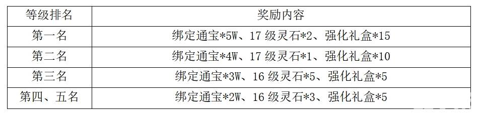 同时新服活动期间,角色等级达到对应的排名也可以获得大量绑定通宝、高级灵石以及强化礼盒的丰厚奖励哦!快去抓紧时间升级吧~