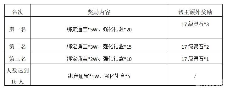 本次新服活动还有帮派排行的活动,新服活动期间,帮派人气值排名前三的帮派全员可以获得大量绑定通宝和强化礼盒的奖励,同时帮主还可以额外获得17级灵石的奖励哦!