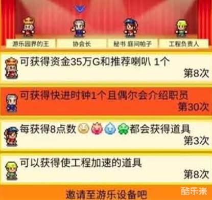 2.新职工的获得是通过特邀嘉宾协会长获得,但是不是每一次邀请成功都会获得,越靠后获得的员工效果越好,每个设施可以满足嘉宾一次,比如,在摩天轮使协会长满足以后,下一次不可以在摩天轮再次邀请协会长,但是假如摩天轮没能满足协会长,下一次仍旧能够邀请协会长到摩天轮。