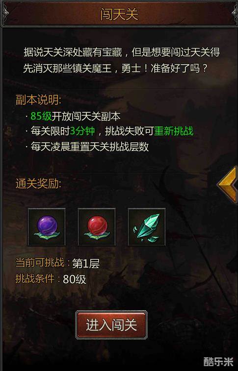 玩家等级到达85级的玩家可以在盟重NPC天关统领处进入副本。