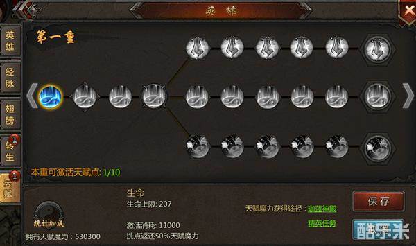 当激活10条属性后自动进阶到下一重,可取消已激活的属性,但只返还50%的消耗材料,尊贵特权会增加返还比例哦。
