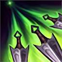投掷五枚苦无,对命中目标造成72魔法伤害。在最大攻击范围边缘的敌人,移速降低50%,持续0.5秒。