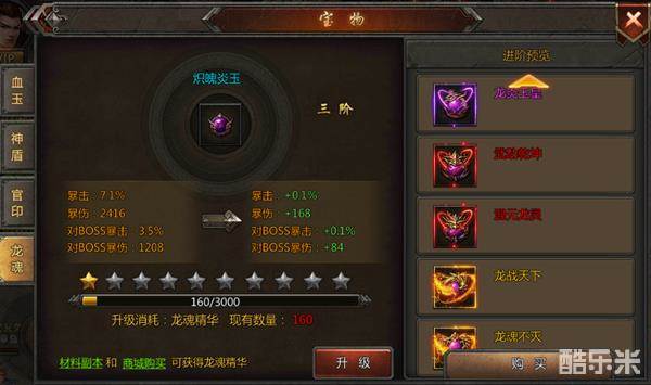 龙魂是《蓝月传奇》当中,专门提供普通暴击率、普通暴击伤害,以及对BOSS暴击率、暴击伤害四项属性加成效果。不难看出玩家们想要打出高额的伤害的话,那么龙魂绝对是你能跟BOSS叫嚣的资本!