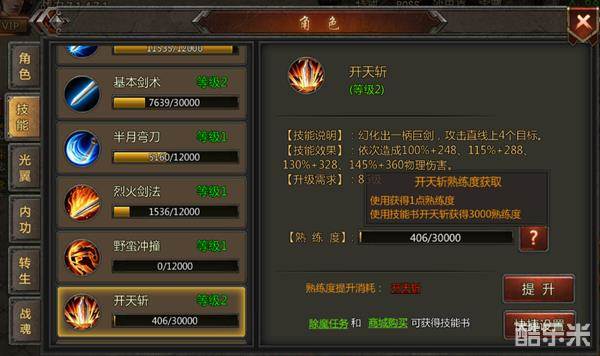 人物有等级上的差别,人物的技能一样也有等级之分,越是高级的技能伤害效果和技能特效就会越好。而提升技能等级的方式无他,只有通过不断地积攒技能的熟练度才能够完成升级。