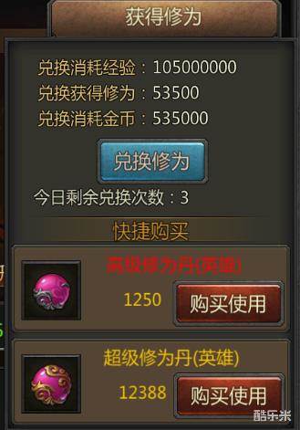 2、修为丹:使用高级修为丹可以获取50000点修为、使用超级修为丹更能获得50000点修为。