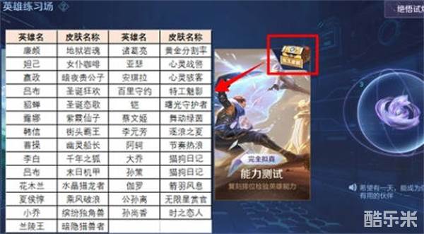 2:接着我们在这个界面中右侧有一个能力测试,在能力测试的右上角可以看到有一个宝箱,这个宝箱就是我们所需要的史诗级皮肤宝箱了;