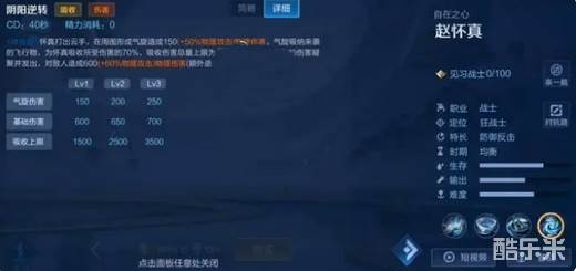 赵怀真的三技能主吸收和伤害。赵怀真打出云手,在周围形成气旋造成150(+50%物理攻击)物理伤害。气旋吸纳来袭的飞行物,为怀真吸收所受伤害的70%,吸收伤害总量上限为1500。之后可将吸收的伤害凝聚并发出,对敌人造成600(+60%物理攻击)物理伤害(额外造成50%的吸收伤害)。