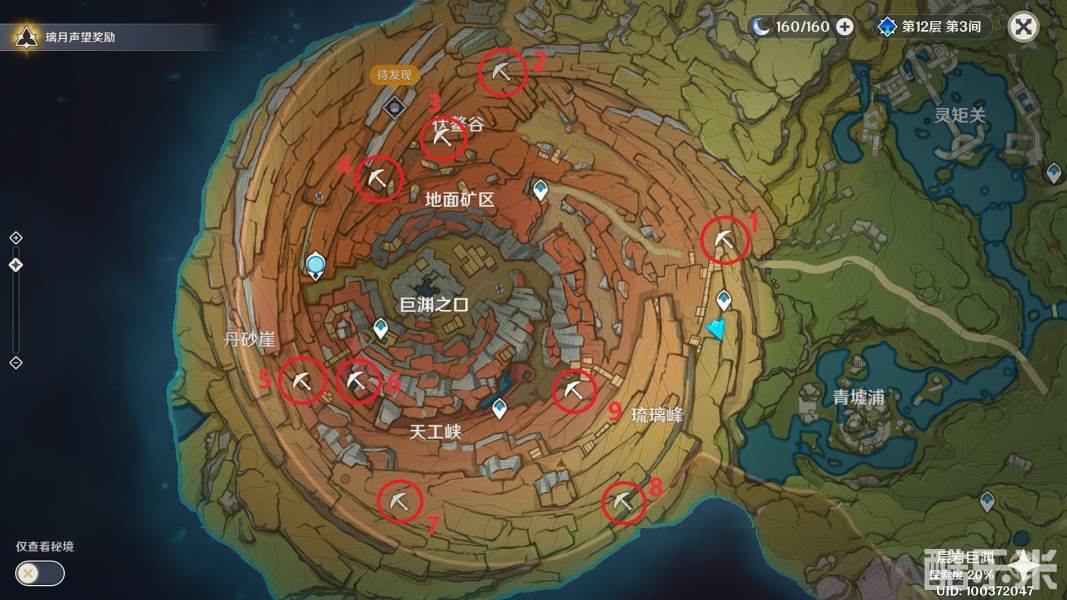 2,9个老石点位如图,大部分都位于悬崖边上,除了3,6,9号位于磐键处,做主线时可以顺便拿了