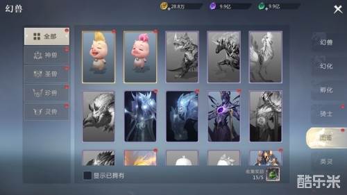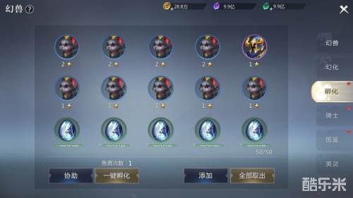 在幻兽面板中,可以看见幻兽面板分为了幻兽、幻化、孵化、骑士、图鉴和英灵等6大页面。