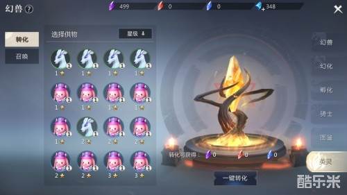 在英灵页面中,神选者可以将自己拥有的多余的幻兽,转化为灵石,并通过灵石召唤新的幻兽。