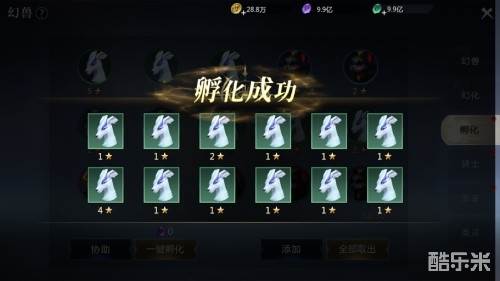 在孵化页面中,神选者可以查看正在孵化中的幻兽蛋以及所需时长,并可以将已经孵化的幻兽取出或进行一件孵化等操作。