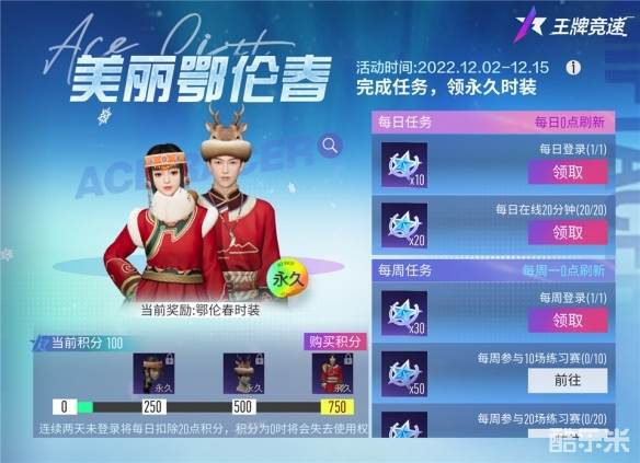 12月2日起至12月15日,车手们每日登录游戏,完成每日任务和每周任务,即可根据任务难度获得数量不等的精选礼积分,积攒足量积分后,就可以兑换鄂伦春永久发型和鄂伦春永久时装!在活动中,车手们还可以免费使用精选礼,提前感受民族服装的特色,也可以花费礼品点购买精选礼积分,加速解锁奖励!