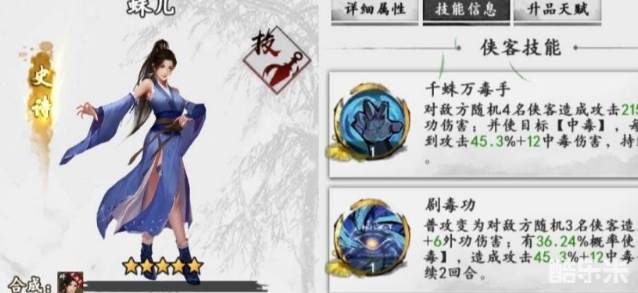 有很多小伙伴们在询问“新射雕群侠传之铁血丹心蛛儿怎么玩”,今天小编就跟大家好好的说一下。金庸的小说应该是很多70后80后的童年了,提到倚天,大家首先想到的也许是主角张无忌、赵敏、周芷若,但其他很多角色的出场,也为大家留下了深刻的印象。作为以小说为背景的手游《新射雕群侠传之铁血丹心》中的她,可是一个百分百上毒的存在,很多玩家会好奇究竟怎么才能玩好她呢?她的哪些技能,可以和哪些侠客搭配,接下来就一起好好来看看吧!